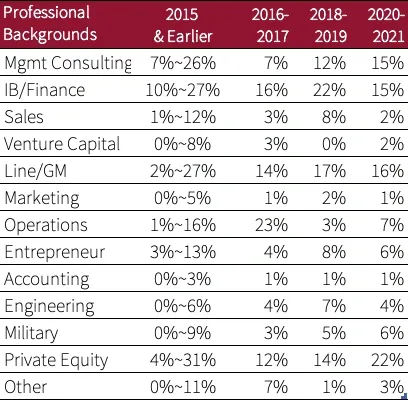 Investors pay close attention to the entrepreneurs, as the acquired businesses are mature and have proven market and product fit. Therefore, investors need to know if the entrepreneur can lead the company to grow sustainably, so they would like to see proof of certain knowledge, skills, and professional backgrounds. Many entrepreneurs come from top consulting firms, investment banks, hedge funds, or private equity funds, while others have served in important positions at large corporations.