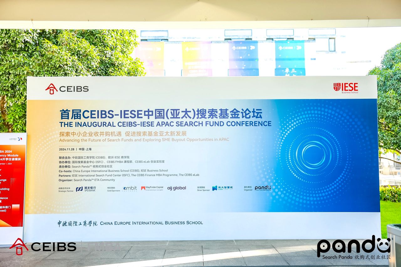 On November 28, 2024, the Inaugural CEIBS-IESE China (APAC) Search Fund Conference was successfully held at the CEIBS Shanghai campus. The conference was jointly hosted by China Europe International Business School (CEIBS) and IESE Business School, with co-hosting partners including the International Search Fund Center (ISFC), the CEIBS FMBA program, and the CEIBS eLab. The event was organized by Search Panda™, an ETA community. The conference focused on the development potential of search funds and entrepreneurial acquisitions in China and the Asia-Pacific region, aiming to provide a platform for industry exchanges and explore how this model can offer new opportunities and growth paths for entrepreneurs, investors, and SMEs.